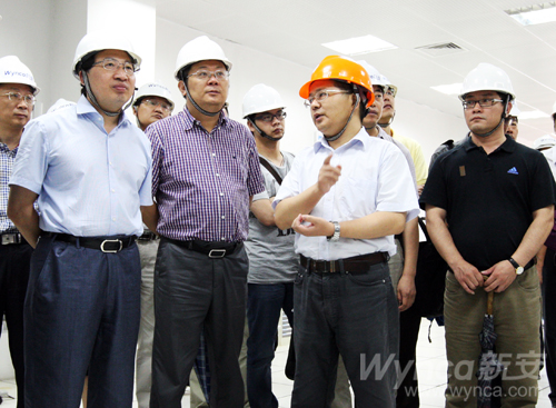 随后,在林加善总裁的陪同下,浙江省经信委医药石化行业管理办公室主任周土法、副主任叶秉海,浙江省石油和化学工业行业协会会长杜世源、秘书长张旭等带领30多家省石化行业龙头企业代表参观集团马目生产基地。图为林加善总裁在新安迈图向参观人员介绍情况。