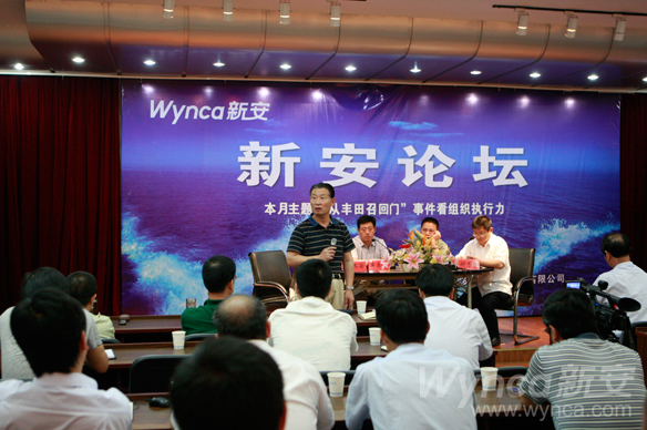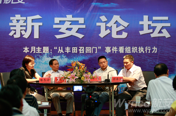 7月25日,第二期新安论坛在九楼会议室如期开讲,本期论坛的主题为“从‘丰田召回门’事件看组织执行力”,洪志标、叶飞、顾卓江、吴启寿、方晗、胡志红6嘉宾在主持人陆冬云的引导串接中,从各自的工作角度出发,围绕如何在公司内提升组织执行力这一内容发表观点。公司领导王伟、潘秋友、林加善、任不凡、姜永平、周家海、包雪传和70余名公司中层干部现场听取嘉宾观点。