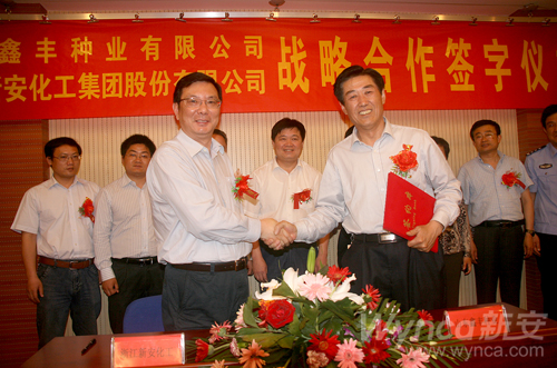 5月6日,集团公司与山东鑫丰种业的合作签字仪式在山东莘县举行。中共莘县县委书记朱加云携该县党政领导参加了签约仪式,季诚建副董事长代表新安集团签字并致辞。